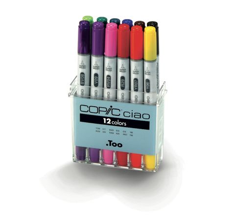 Le marqueur double-pointe CIAO est idéal pour commencer avec COPIC. Il dispose des mêmes pointes interchangeables que le COPIC SKETCH: une pointe biseautée et une pointe pinceau souple, mais avec un nuancier plus réduit: 180 couleurs au lieu de 358.