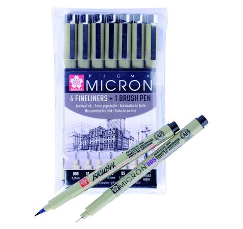 Contenu du set : Feutres Pigma micron n°005, 01, 02, 03, 05 et 08+ 1 brush pen - Largeurs de trait : 0,20 - 0,25 - 0,3 - 0,35 - 0,45 et 0,50 mm