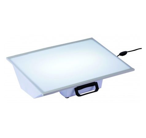 Surface inclinée en méthacrylate diffusant. Format A3 (470x320mm). Deux positions à plat ou sur un chant. 1 tube de 15W. Lumière du jour : 6200°K. Poids 1,9 Kg.
