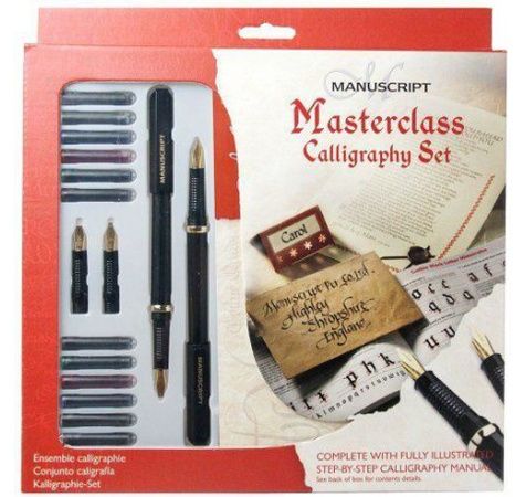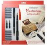 Coffret d'initiation à la calligraphie contenant 2 stylos, 4 plumes pour la calligraphie, 12 cartouches d'encre assorties, un bloc d'écriture avec feuilles réglées pour vous guider et un manuel pour apprendre la calligraphie.