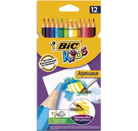 Pochette 12 Crayons De Couleur Aquarellable Aquacouleur. Corps 17,5cm. Coloris Assortis