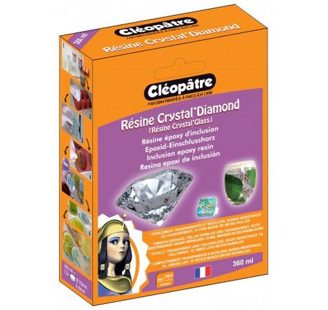 et transparente comme du verre - Une fois le produit sec, la résine a un effet brillant comme du cristal - Cette formulation spécifique crée 10 fois moins de bulles que les résines classiques ou les résines de glaçage et elle a une bonne tenue aux UV- La résine Crystal' Diamond est parfaitement adaptée pour être déposée ou moulée pour des épaisseurs comprises entre 4 à 100 mm d'épaisseur, elle est très appréciée pour créer des bijoux avec des moules, des fonds de plateau avec incrustation d'objets, des inclusions dans le milieu floral, etc. - Ce coffret comprend 2 flacons de 120 ml de résine + 1 flacon de 120 ml de durcisseur + 1 notice complète + 1 paire de gants + 2 spatules + 2 gobelets doseurs + 1 pipette de précision - Mélange en 2 doses de résine pour 1 dose de durcisseur