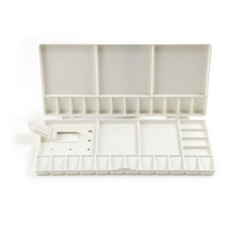 Palette plastique pliante avec d'un coté 18 compartiments et de l'autre côté 15 compartiments.