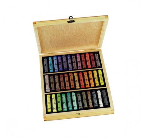 Coffret luxe en bois verni, tapissé de mousse et garni de pastels Sennelier.