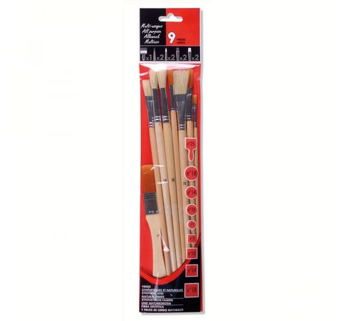 Pochette de 9 pinceaux multi-usage comprenant 4 pinceaux ronds, 4 pinceaux plats et 1 spalter (n°25, 18, 14, 10 et 2). Pinceaux aux fibres synthétiques et naturelles.