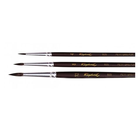 Set de 3 pinceaux ronds en petit-gris pur, n°4, n°12 et n° 18, qualité enseignement, viroles en alu anodisé, manches courts laqués marron foncé. Pour les détails.