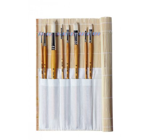 Pochette de 8 brosses soies de porc, 420R n°1, 10 et 24 , 430P n°4, 10 et 16 , 440U n°4 et 12 + natte bambou. Sélection complète pour débuter.