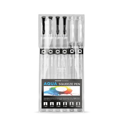 Pinceaux à réservoir Molotow Aqua Squeeze lot de 6 : Pinceau à réservoir en poils synthétiques, pointe souple d'une largeur 7mm. Remplissage facile, capacité : 8ml environ. Application simple et propre, modèle équipé d'un capuchon pour éviter le dessèchement de la pointe. Pour l'application de peinture fluide et d'encre