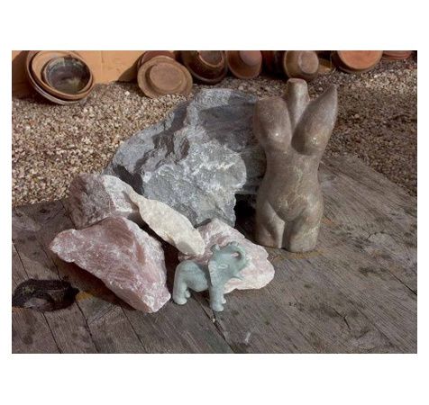 Pierre ollaire ou pierre à savon. Se travaille avec des rifloirs. Différentes formes, différentes couleurs aléatoires.