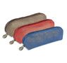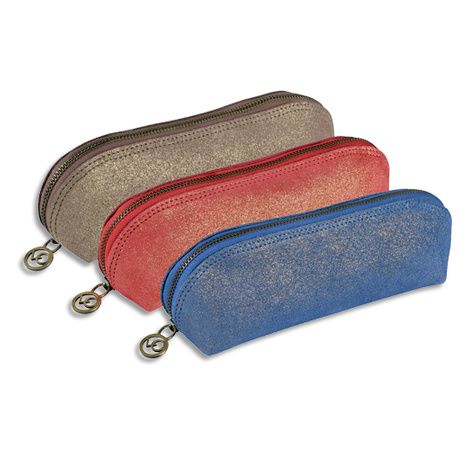 En cuir de vachette pailleté. Les paillettes sont incrustées à chaud afin de rester sur la trousse. Très souple et résistant. Doublure textile. Dimensions : 21 x 6,5 x 6,5 cm. Coloris assortis : rouge, bleu, taupe.