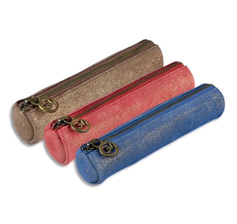 En cuir de vachette pailleté. Les paillettes sont incrustées à chaud afin de rester sur la trousse. Très souple et résistant. Doublure textile. Dimensions : 17 x 3,5 cm. Coloris assortis : rouge, bleu, taupe.