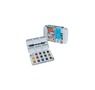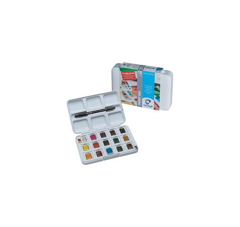 Boîte en plastique avec palette directement intégrée dans le couvercle + 1 mini pinceau rétractable. Contient un assortiment de 12 ½ godets d'aquarelle fine Van Gogh + 3 couleurs gratuites. Palette détachable, facilitant son nettoyage.