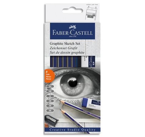 Set de dessin graphite : 6 crayons graphite Goldfaber (2H, HB, B, 2B, 4B, 6B). Taille-crayon et gomme sans PVC inclus.