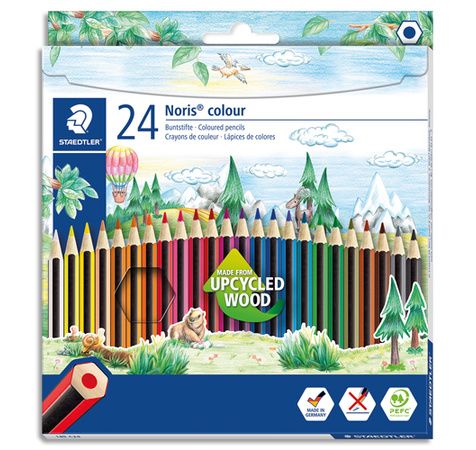 Crayons de couleur hexagonaux. Fabriqués en bois upcyclé, selon un procédé innovant permettant de recycler même les plus petits résidus de bois. Mine ultra résistante. Bois certifié, issu de forêts allemandes gérées durablement.