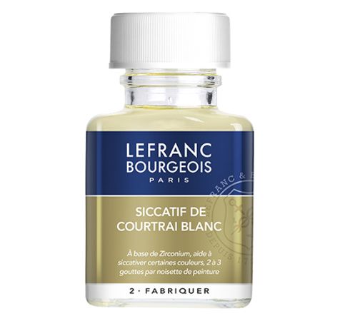 Le siccatif de Courtrai blanc, formulé sans plomb, ne contient que du Zirconium, n'accélère pas la prise ni le séchage au toucher, mais en améliore le durcissement.