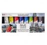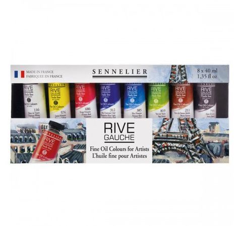 Set de 8 tubes de 40ml de peinture à l'huile Rive Gauche. Couleurs : Blanc de titane, jaune primaire, rouge primaire, bleu outremer clair, bleu primaire, vert de vessie, terre de Sienne brûlée, noir d'ivoire.