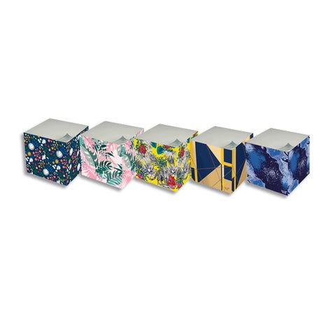 Bloc cube 9x9x8cm 610 feuilles blanches encollées 80g PEFC. Décors assortis.