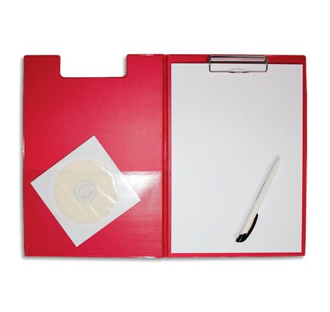 Porte-bloc à rabat A4 en PVC avec pince métal. Pochette intérieure/porte-stylo. Coloris rouge