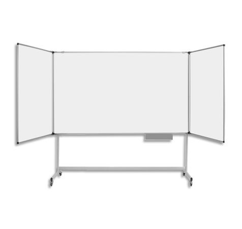 Tableau blanc tryptique avec structure mobile avec 4 roulettes à blocage en caoutchouc. Grande zone d'écriture. Surface magnétique effaçable à sec. Le tryptique peut cacher des notes confidentielles ou déjà préparées. Auget en acier anodisé inclus.