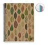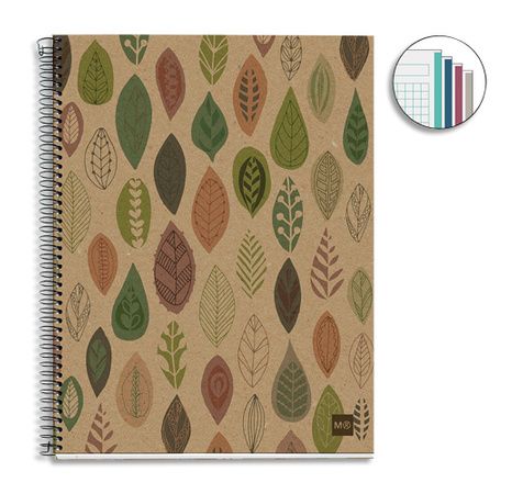 240 pages détachables par micro perforations et perforées. Couverture en carte 100% recyclé. Reliure à spirale simple. Réglure quadrillée 5x5. 4 bandes de couleurs sur le bord des pages pour 4 parties distinctes. Papier 100% recyclé post-consommation 80 g blanc. Coloris kraft à motifs feuilles.