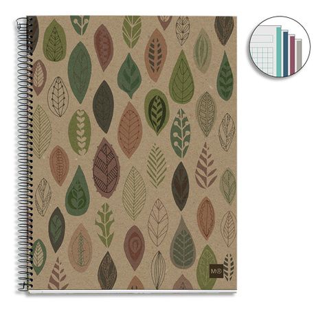 240 pages détachables par micro perforations et perforées. Couverture en carte 100% recyclé. Reliure à spirale simple. Réglure quadrillée 5x5. 4 bandes de couleurs sur le bord des pages pour 4 parties distinctes. Papier 100% recyclé post-consommation 80 g blanc. Coloris kraft à motifs feuilles.