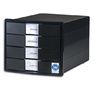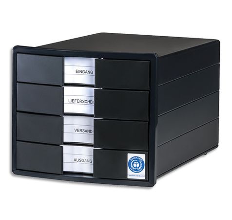 En polystyrène, 100% matériaux recyclés. 4 tiroirs, munis de butée d'arrêt. Livré avec de larges étiquettes interchangeables. Dim (lxhxp): 28x23,5x36,7cm.