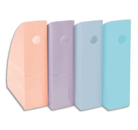 En polystyrène avec oeillet de préhension. Pour documents format A4+. Dos de 8.2 cm. Dimensions (h x p) : 30,5 x 56,6 cm. Coloris pastel assortis : Bleu, Corail, Mauve et Vert.