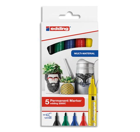 Corps métal. Encre indélébile, sans solvant. Séchage rapide. Faible odeur. Résiste à la lumière et à l'eau. Capuchon à la couleur de l'encre. Pochette de 5 marqueurs assortis 2000 C.