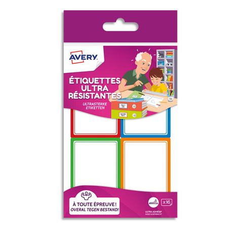 Blister de 16 étiquettes blanches à bordure rouge, bleue, verte, orange.