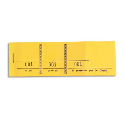 Bloc de 100 feuillets numérotés de 1 à 1 000. Composé de 3 volets détachables dont 2 par microperforations. Inscription : talon, contrôle, à conserver par le client.