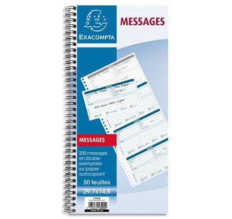 Capacité de 200 messages autocopiants duplis (50 feuillets/ 4 par page). Pour noter les messages, les transmettre et garder une copie. Dos à double spirale pour une utilisation intensive, au bureau comme à l'extérieur.