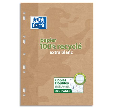 Perforation 9 trous. Papier extra blanc 100 % recyclé, fabriqué à partir de fibres de récupération et blanchi sans chlore.