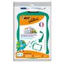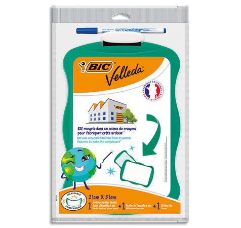 Ardoise double-face conçue à partir de crayons Bic recyclés. Possède une face blanche pour dessiner et une face avec des lignes séyès pour écrire. Design ergonomique, adapté aux petites mains. Fournie avec une effaçette qui se pose à l'ardoise et un feutre effaçable à sec Bic Velleda 1721 Bleu.
