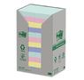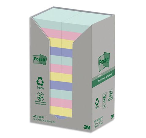 La note Post-it® 100 % écologique, papier 100 % recyclé. Sans emballage individuel, tour distributrice en carton recyclé d'une seule couleur pour faciliter le désencrage. Tour composée de blocs de 100 feuilles jaunes ou coloris assortis (vert menthe, bleu ciel, bleu, rose pâle, rose).