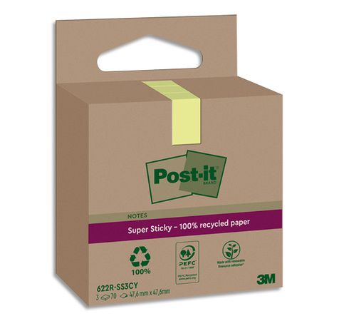 Lot de 3 blocs notes Super Sticky Recyclées 47,6x47,6 mm. Jaune Pastel.