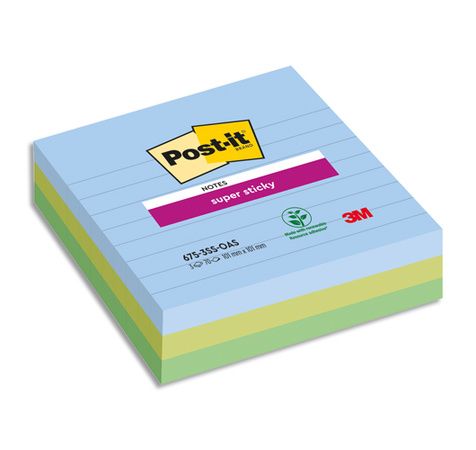 POST-IT® Notes Super Sticky Grand Format Lignées Oasis. 101 x 101 mm. 3 blocs, 70 F. bleu et vert.