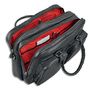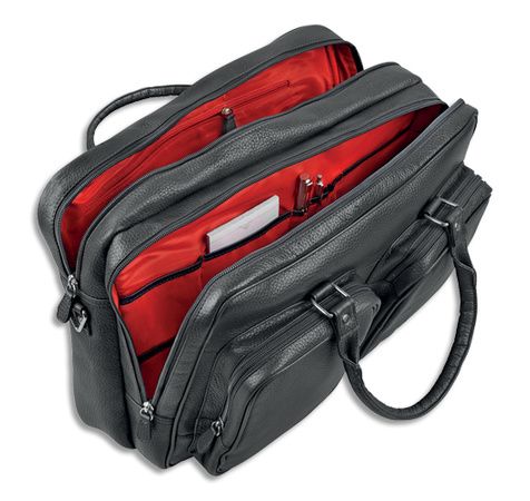 En cuir pleine fleur de vachette grainée. Souple avec une excellente résistance. Conçue pour les déplacements professionnels de plusieurs jours. Large bandoulière réglable et amovible en coton, 2 anses en cuir. Fermeture par zip intégral. 2 grands compartiments principaux et 2 poches latérales zippées avec ouverture à 45°. Dimensions : 42 x 30 x 15 cm.