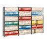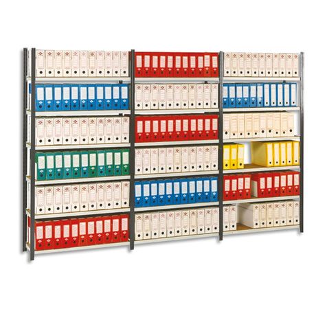 Idéal pour le stockage de boites d'archives. Montants de hauteur 200 cm époxy gris anthracite, sans perforation en façade, acier 8/10 profilé à froid, 10 plis. Tablette tubulaire de longueur utile 94 cm, finition galvanisée ayant une capacité de charge de 175 Kg UR par niveau. 5 niveaux pour les profondeurs 35 et 70 cm et 6 niveaux pour les profondeurs 50 cm, réglables tous les 4 cm. Embouts plastique aux pieds pour éviter le poinçonnement du sol.