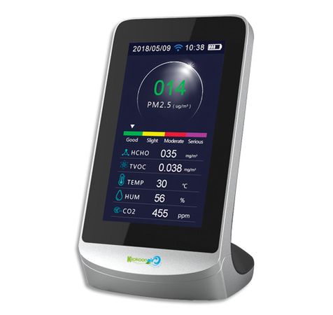 Détecte le dioxyde de carbone (CO2), le formaldéhyde (HCHO), les composés organiques volatils totaux (COVT), les particules <2,5 microns (PM2,5 / 1,0 / 10), la température, et humidité avec horloge et fonction enregistrement.