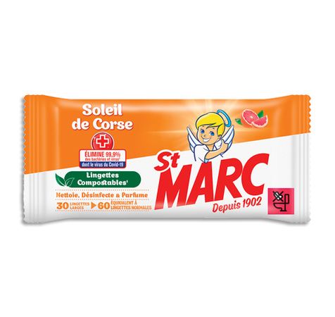 Lingettes antibactériennes compostables soleil de Corse. Composé de fibres de viscose. Disparait en moins de 42 jours. Dimensions : 17,5 x 19 cm. Paquet de 30 lingettes extra larges (60 normales).