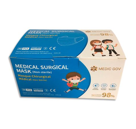 Masque enfant. Dimension : 14,2 x 9,8 cm. Masque chirurgical 3 plis Type IIR. Jetable. Non stérile. Norme EN14683 : 2019. Efficacité de filtration bactérienne > 98 %. Boite de 50.