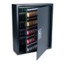 A ouverture électronique de haute qualité (+ 2 clés de secours fournies). Fente sur le côté permettant en l'absence de la personne responsable d'insérer les clés armoire fermée. Equipée d'un système anti-crochetage. Porte en tôle d'acier épaisseur 4 mm, corps 2 mm. Fermeture à double pannetons. Barrettes à crochet réglables en hauteur. Livrée avec les portes clés correspondants et vis pour fixation murale. 4 piles 1,5 AA (LR6), non fournies. Peinture mate anti-rayure. Coloris gris anthracite.