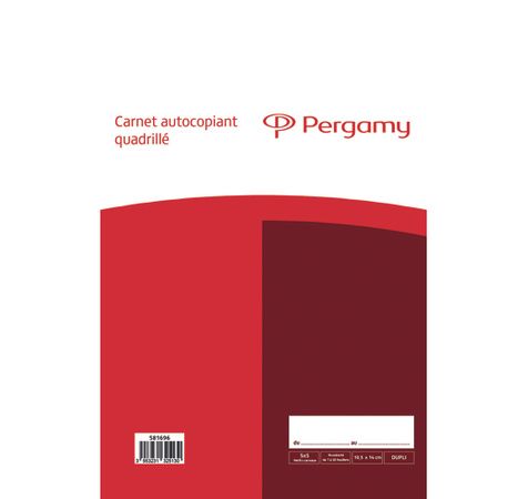 Couverture carton couché 2 faces 350 g/m2. Intérieur : papier autocopiant avec une première feuille de quadrillage bleu 5 x 5, feuille intermédiaire liseré rouge, folio rouge et dernier feuillet folio vert. Feuillets blancs numérotés de 1 à 50. Intercalaire détachable en début de carnet. Dessous carton rigide, dos toilé.