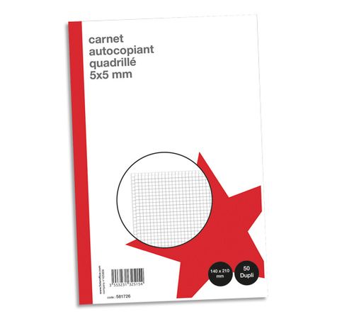 Couverture carton couché 2 faces 350 g/m2. Intérieur : papier autocopiant avec une première feuille de quadrillage bleu 5 x 5, feuille intermédiaire liseré rouge, folio rouge et dernier feuillet folio vert. Feuillets blancs numérotés de 1 à 50. Intercalaire détachable en début de carnet. Dessous carton rigide, dos toilé.