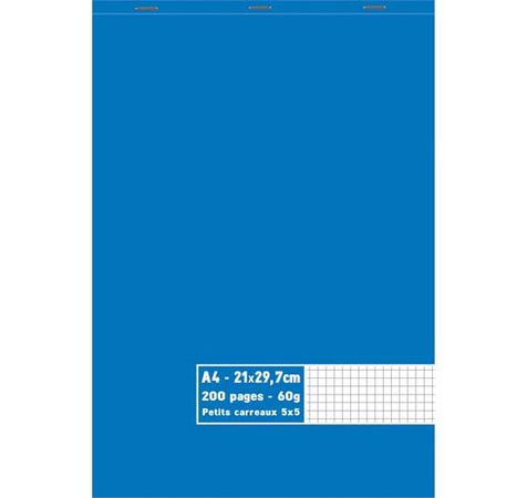 Bloc 60g agrafé en tête 200 pages quadrillées 5x5. Format A4 21 x 29.7 cm