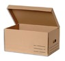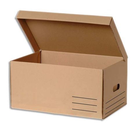 En carton grande rigidité recouvert de papier brun, 100 % recyclé et recyclable. Ouverture sur le dessus. Couvercle attenant Zones d'indexation et poignées latérales. Dimensions (L x h xp) : 55,9 x 37,3 x 26,4 cm. Conditionnement minimum : 10
