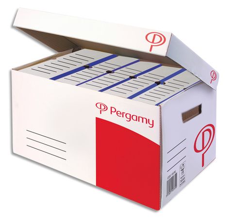 En carton ondulé recouvert de papier blanc, 100 % recyclé et recyclable, ouverture sur le dessus. Zones d'indexation et poignées de préhension. Fond automatique plat. Dimensions (L x h x p) : 53,9 x 35,9 x 28 cm. Capacité : 5 boîtes archives dos 10 cm .