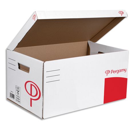 En carton ondulé très résistant recouvert de papier blanc. 100 % recyclé et recyclable. Ouverture sur le dessus. Couvercle attenant . Transport aisé grâces auX deux poignées latérales. Zone d'indexation. Superposable sur 2 m de hauteur. Charge maximale : 25 kg. Dimensions (l x h x p) : 52 x 25 x 34 cm. Capacité : 5 boîtes à archives Dos 10 cm .