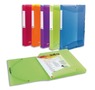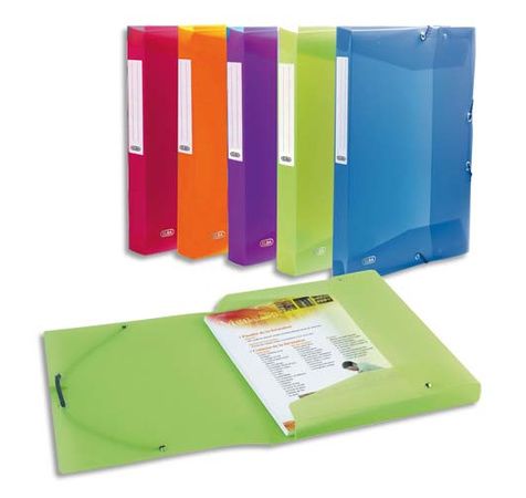 En polypropylène translucide 6/10e. Etiquette de dos. Fermeture par élastiques coulissant. Coloris translucides assortis : bleu, vert, framboise, violet, orange. Dimensions : 25 x 33 cm. Pour format A4. Conditionnement conseillé : 10