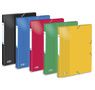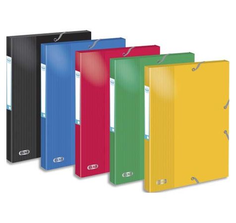 En carte pelliculée 7/10ème. Fermeture par élastiques. Dos 2,5 cm. Dimensions : 24 x 32 cm. Pour format A4. Coloris assortis : noir, bleu, rouge, vert, jaune. Conditionnement conseillé par 12